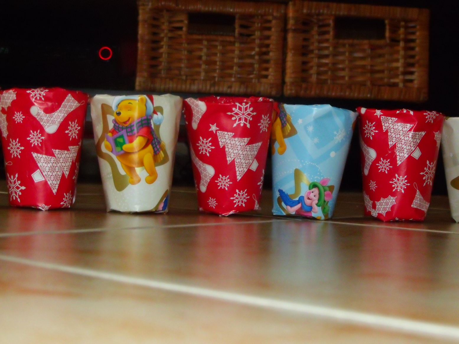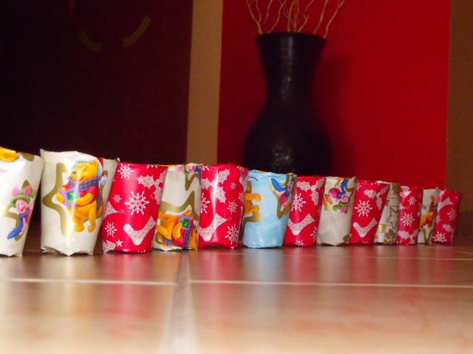 Mint már korábban is említettem, igen fórumfüggő vagyok. Aminek sok negatív de még több pozitív oldala is van 🙂 A negatív csupán annyi, hogy más dolgoktól veszem el az időt, de ez még talán belefér 🙂 A pozitív (az egyik a sok közül) ismételten a lányok millió meg egy ötlete, amiért nem győzök nekik hálálkodni 🙂 Időm végülis jelenleg még rengeteg (de véges), de valahogy sose kapott el a gépszíj, nem vagyok az a fajta, aki pepecsel, ragaszt, varr, rajzol…. Aztán a sok ötletet olvasva tegnap megszállt az ihlet, bár este még nem körvonalazódott rendesen. Mindenesetre találtam a kamrában műanyag poharakat, amik a nyári kerti partiról megmaradtak. Bár lehet h. Tesómék hozták, ha esetleg rájönne, majd kifizetem neki az árát :):):) Szóval ez volt a kiindulás, aztán fogalmam sem volt mivel és hogyan vonjam be. Este még alufóliába csomagoltam, de az valami borzalom volt, nem is részletezném, de ebből is látható, hogy tényleg nem értek az ilyen fajta dolgokhoz :))) És akkor reggel úgy döntöttem addig nem nyugszom, amíg nem találok megoldást. És lám, találtam, mégpedig egy csomó megmaradt kisebb-nagyobb darab csomagolópapír formájában. Ezeket szépen összeszedtem és elkezdtem becsomagolni a pohárkákat. A végeredmény: 24 karácsonyiba csomagolt partikellék felfűzve. Már csak helyet kell találni neki, mert a tervezett tv fölötti rész keskenynek bizonyul, nem fér el. Majd apával kiokoskodjuk, meg azt is, hogy mik kerüljenek bele. Pár ötlet már van, de 24 még nincs 🙂 Szóval nov. 30-ig mindennek meg kell lennie, hogy 1-jével indulhasson a visszaszámlálás.