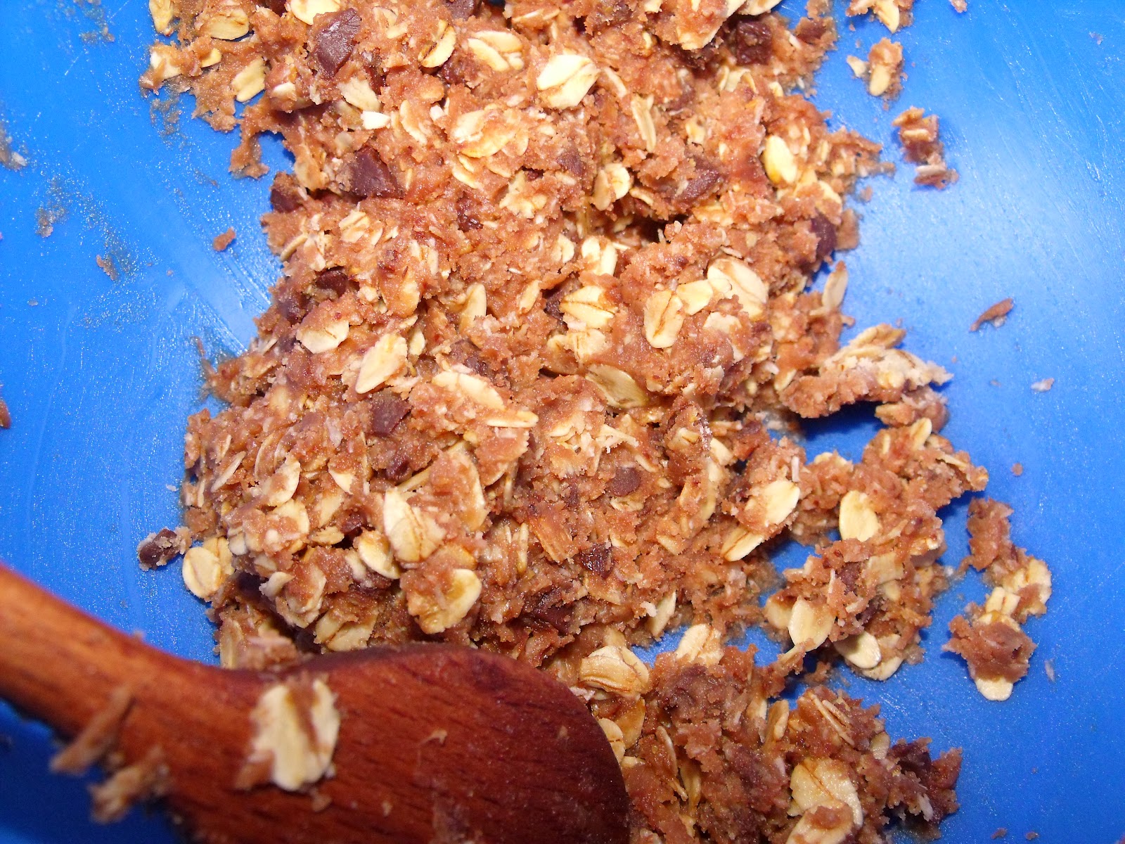 A mézet hozzákeverjük az olvasztott margarinhoz, majd az egészet hozzáöntjük a lisztes-csokis-zabpehelyhez. Egy ilyen állagú masszát kell kapjunk: