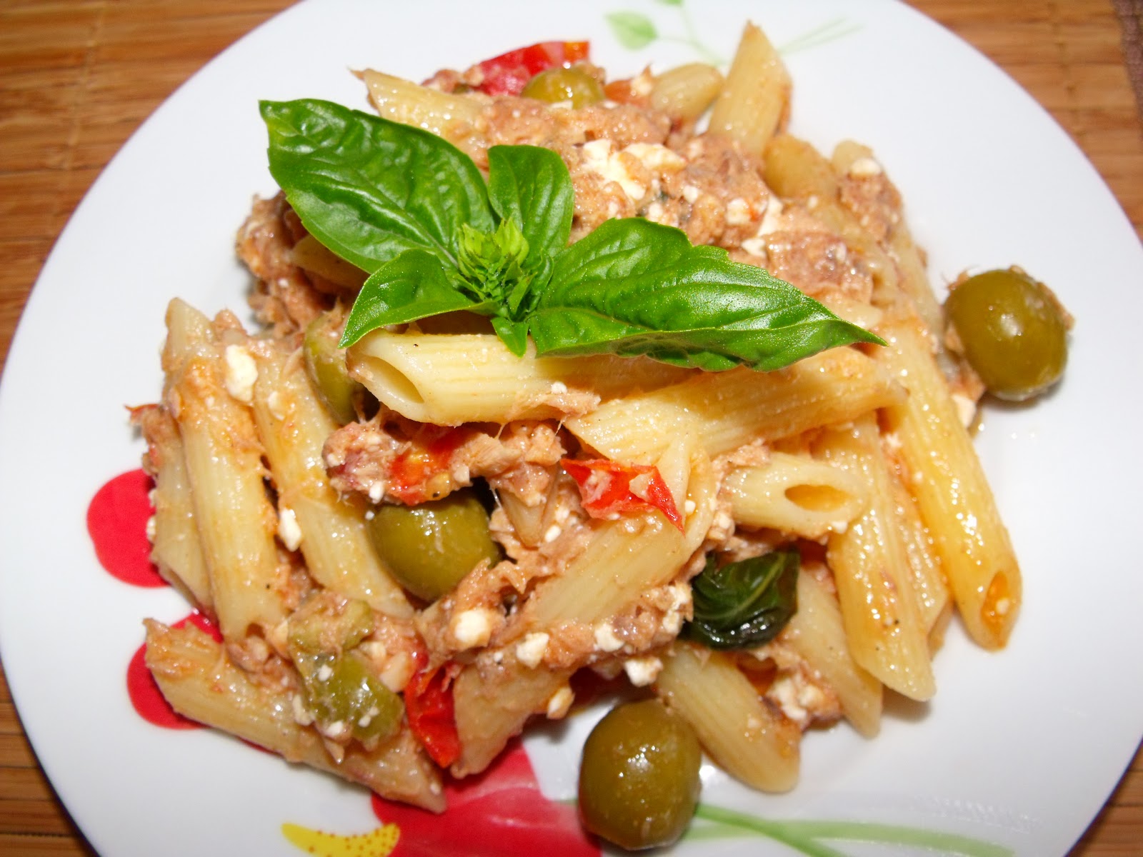A tésztát lobogó vízben feltesszük főni. Ezalatt a tonhalról leszűrtem az olajat, abban egy serpenyőben odadobtam a paradicsomot, a fokhagymát, a bazsalikomot, és összepároltam. Sóztam, borsoztam. Hozzáadtam a tonhalat, az összemorzsolt fetát, az olajbogyót, még egy kicsi olíva olajjal meglocsoltam, végül összeforgattam a kifőtt tésztával. Langyosan a legjobb. Jó étvágyat hozzá!